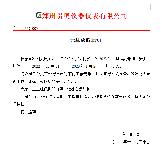 2023年元旦佳節(jié)將至,首先向全體員工致以節(jié)日的問候,為了大家能度過歡樂、祥和、平安的節(jié)日,特提醒全體人員注意以下幾點(diǎn):
