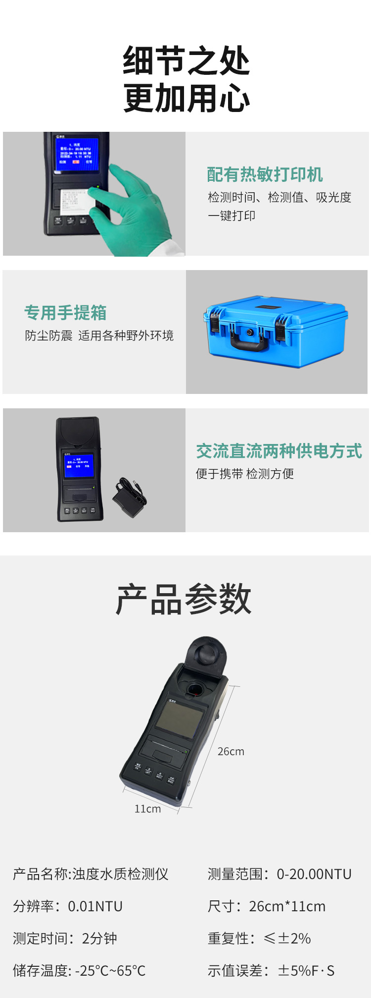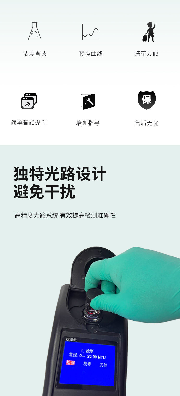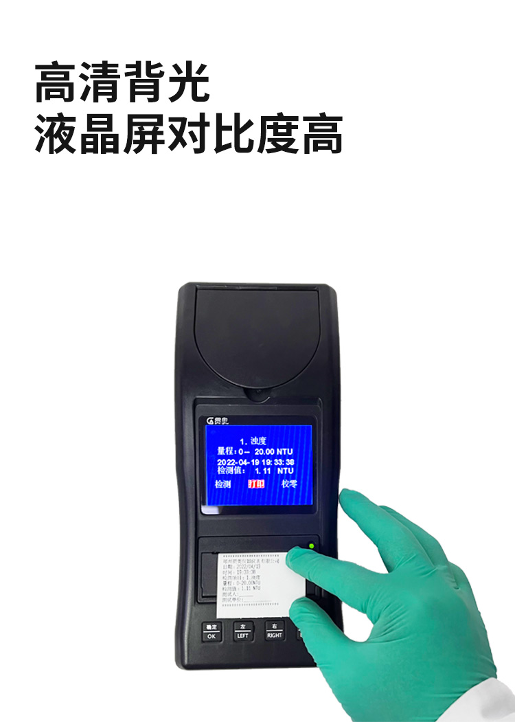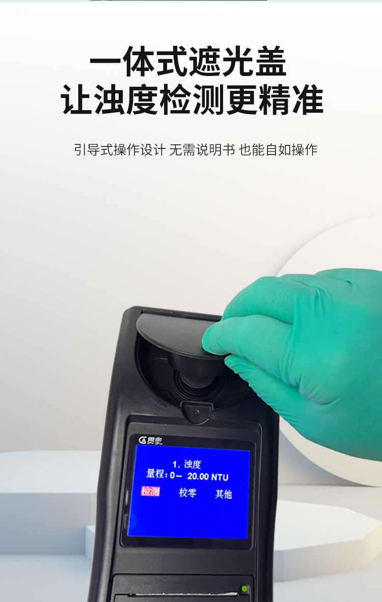 貫奧濁度水質(zhì)檢測儀可快速準確測定地表水、地下水、城市污水及工業(yè)廢水中濁度指標,濃度直讀;可廣泛用于水廠、食品、化工、冶金、環(huán)保及制藥行業(yè)等部門。儀器是由單個的固定波長固定用途的分光光度計糅合而成的,采用分光光度法原理對各參數(shù)進行測量,在儀器中建立不同參數(shù)的濃度顯色程度與吸光度的線性曲線,儀器通過對顏色的辨別,得出被測水樣的濃度。本儀器采用全中文菜單,操作簡易易懂,使用方便快速測量準確度高。