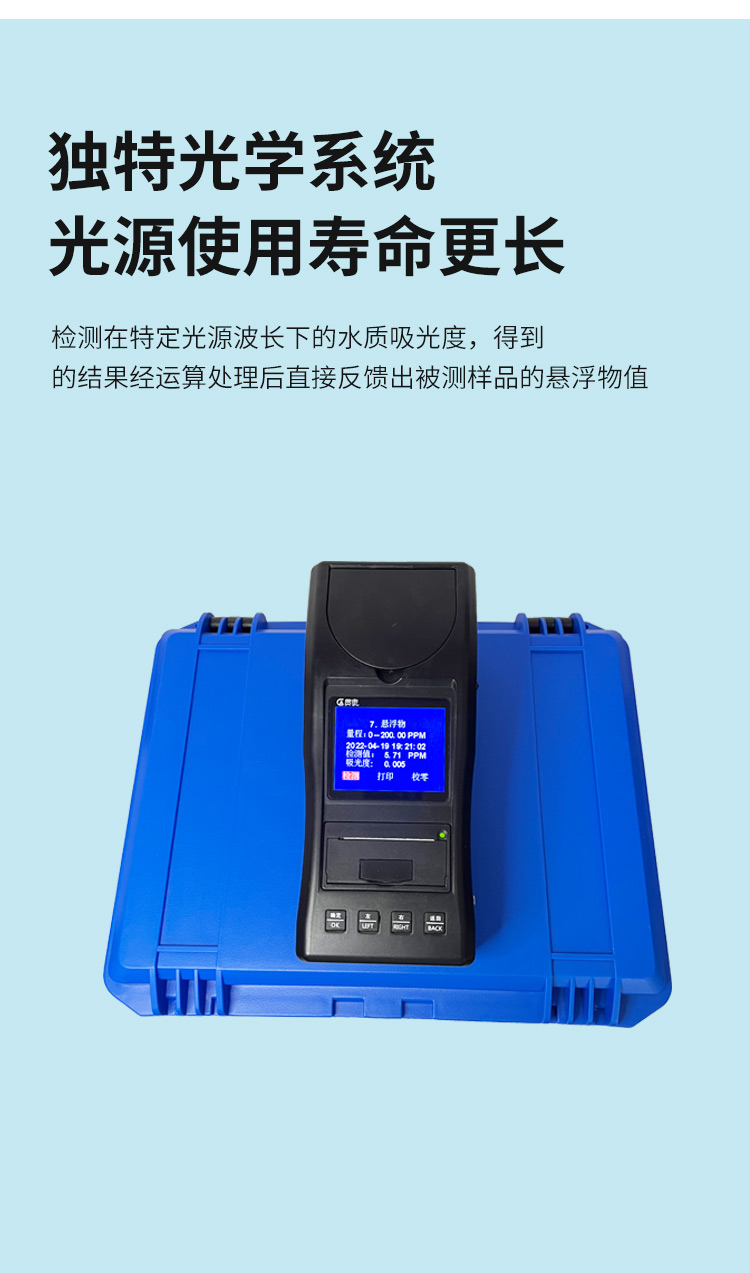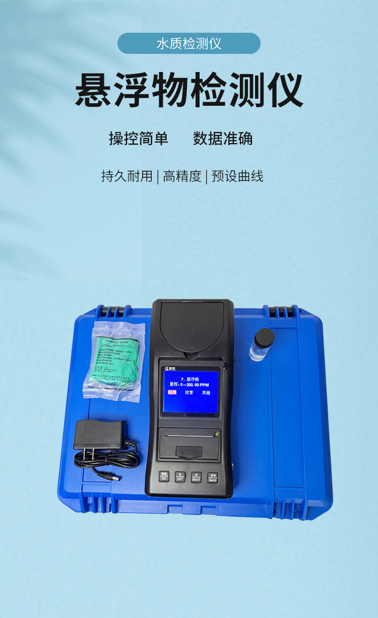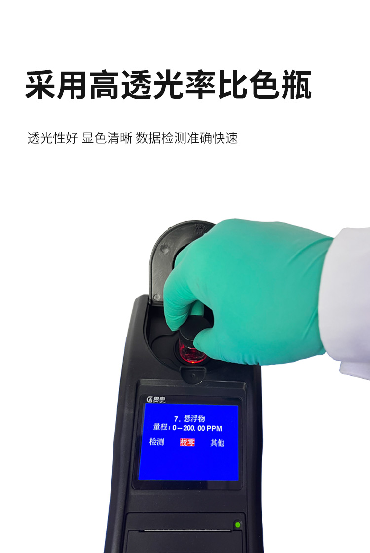 懸浮物水質(zhì)檢測(cè)儀可快速準(zhǔn)確測(cè)定地表水、地下水、城市污水及工業(yè)廢水中懸浮物指標(biāo),濃度直讀;可廣泛用于水廠、食品、化工、冶金、環(huán)保及制藥行業(yè)等部門(mén)。儀器是由單個(gè)的固定波長(zhǎng)固定用途的分光光度計(jì)糅合而成的,采用分光光度法原理對(duì)各參數(shù)進(jìn)行測(cè)量,在儀器中建立不同參數(shù)的濃度顯色程度與吸光度的線性曲線,儀器通過(guò)對(duì)顏色的辨別,得出被測(cè)水樣的濃度。本儀器采用全中文菜單,操作簡(jiǎn)單易懂,使用方便快速測(cè)量準(zhǔn)確度高。